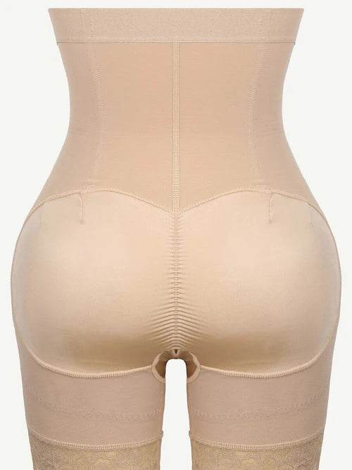 Високоталийни оформящи шорти с трипластова коремна зона и четири карбонови стоманени банела, които държат талията стабилна без свличане. Комбинацията от YKK цип и вътрешни куки осигурява прецизно стягане и лесно обличане. Зоната между краката е с припокриваща се конструкция за дискретност и удобство. Еластичната материя в седалището оформя и повдига, а дантелените краища със силикон предотвратяват навиване.